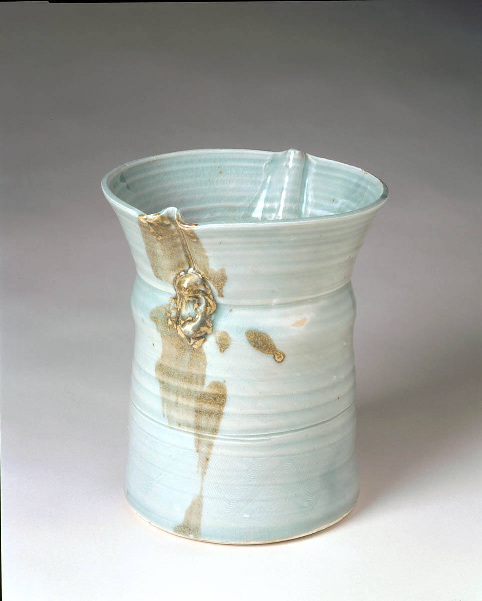 DescriptionCylindrical, vaselike vessel with flared rim. Rim has two, deep, vertical indentations (one on each side). "C"-shaped elements (pseudo-handles) are attached at the base of these indentations. Glaze is pale green with a brown overglaze applied in and below the rim indentations.Copyright© Estate of Kenneth Ferguson