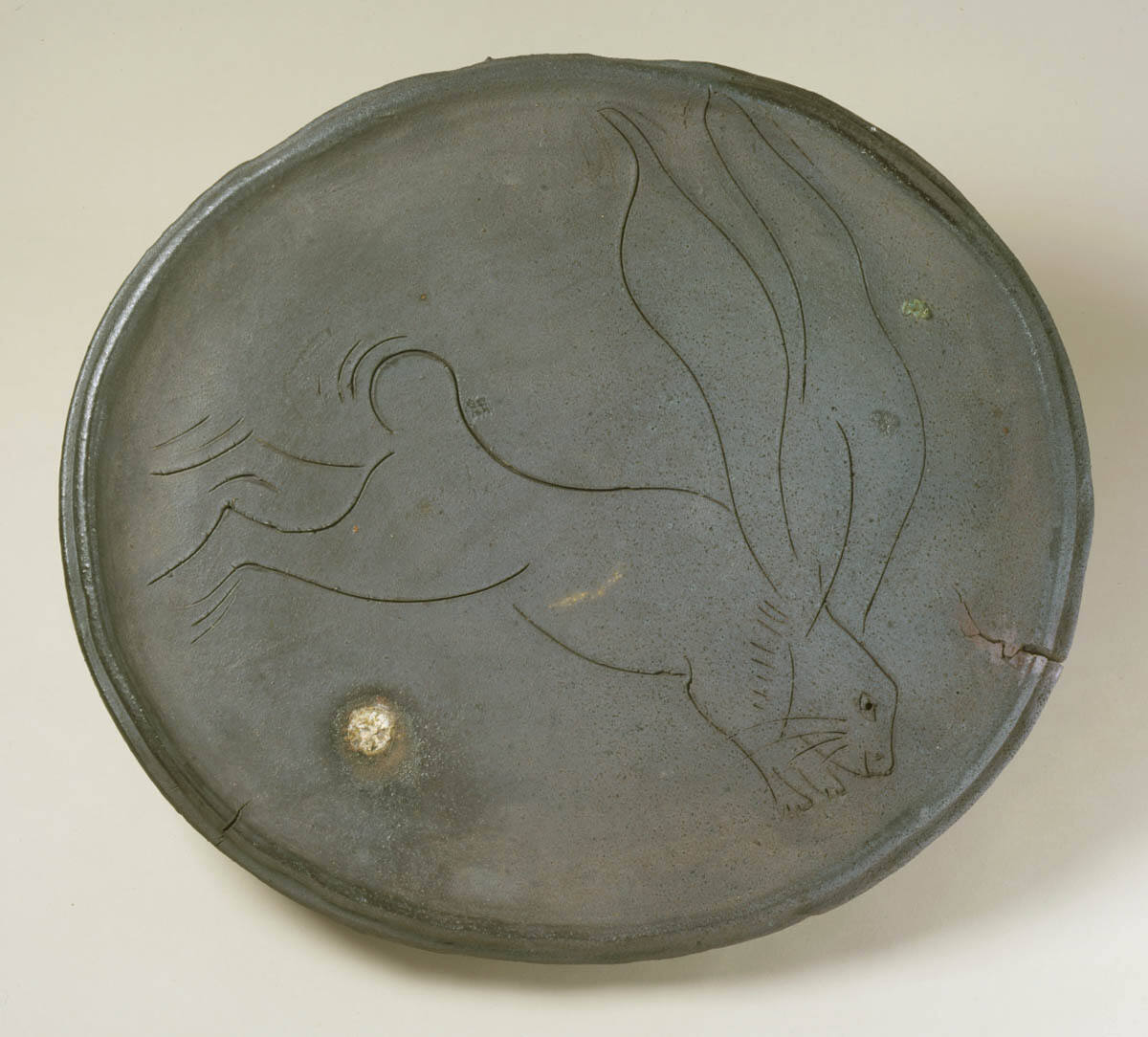 DescriptionThick, oval-shaped ceramic platter with double rim. Mottled, dark grey-black color with leaping hare incised into the upper surface.Copyright© Estate of Kenneth Ferguson