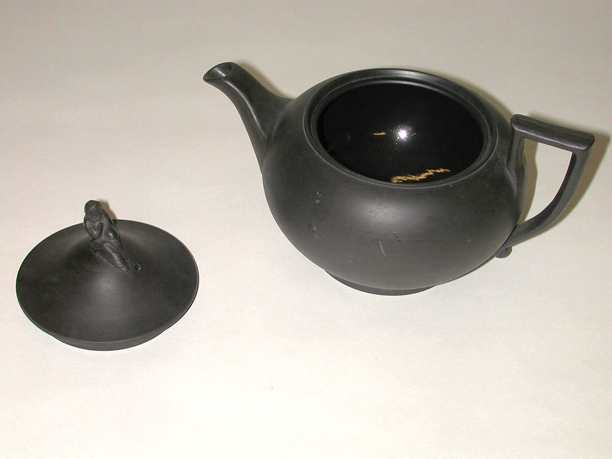DescriptionBlack (basalt), unglazed, smooth surface, lidded teapot. A seated figure wearing a hooded robe acts as knob of lid. Upper part of handle and spout are squared.