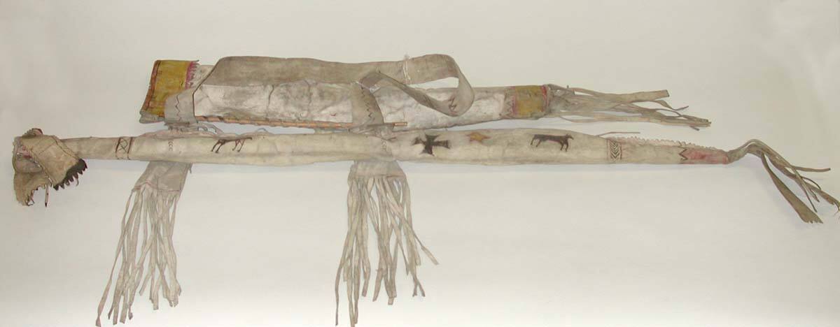 DescriptionA wooden bow with bowstring, a leather bow case, and a leather arrow quiver. The bow case and quiver are decorated with painted geometric and animal designs.