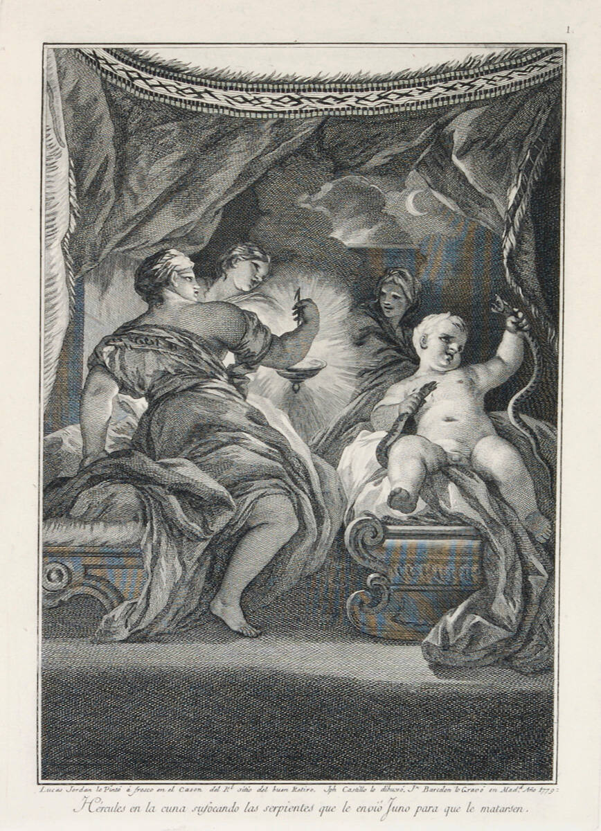 DescriptionThis engraving was made from a drawing by José del Castillo after a mural by Luca Giordano. In front of a bordered, fringed textile hanging, a naked child at right grasps a snake in each hand; the child holds each snake below its head. At left, a seated woman seen from the rear holds a key-like instrument over a glowing basin. She is regarded by two other women beyond. Above the head of the woman at right rear is a crescent moon.