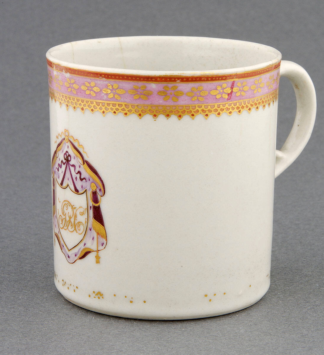 DescriptionNarrow borders in pink, red, and gold. Initials G.P.C. within shield.
