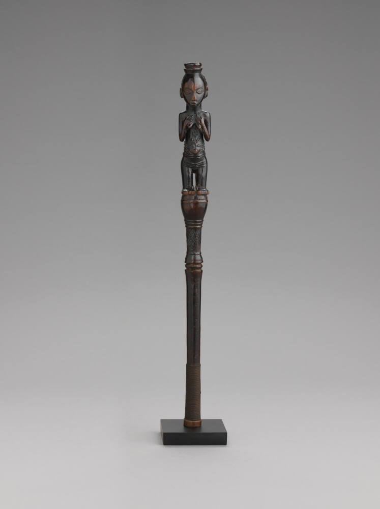 DescriptionA wooden female figurine stands atop a staff twice her length (the whole in one piece), the upper part of which is decorated with circular grooves and striped lozenges. The woman has a high, curved forehead topped by a double ring; almond-shaped eyes, oval ears, and a coffee bean-shaped mouth. The coiffure includes a striped diadem at the back of the head, and a cross-bun. Arms folded, with the hands resting above the breasts. Pattern of cheloid scarifications on the torso and around the waist; horizontal folds under the navel. Legs apart, feet resting on the round base. Fingers and toes well-delineated. The lower part of the staff is wrapped in dark thread, and ends with a copper ring. Fine-grained reddish brown wood, glossy darker patina.ProvenanceJacques de Prince, Brussels, Belgium [1];