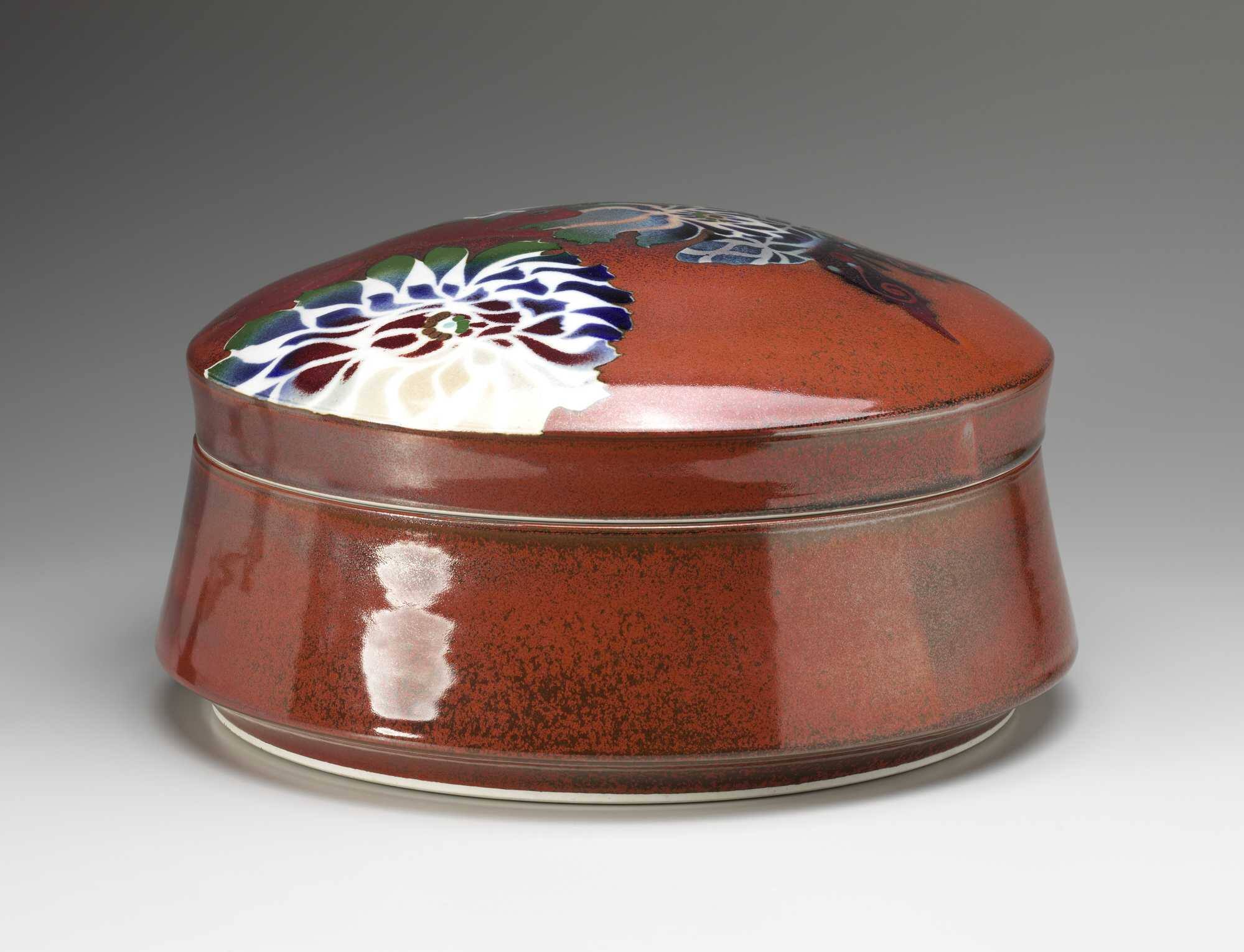 DescriptionWheel-thrown porcelain covered cylindrical box with cinnabar red glaze, with a crimson newt among three polychromed flowersGallery LabelVictor Babu is a key figure in the story of ceramics in Kansas City, having taught at the Kansas City Art Institute from 1967 to 2001 and maintaining a prolific studio. Although a colleague and friend of Ken Ferguson, Peter Voulkos and Rudy Autio, Babu’s refined porcelain vessels contrast with the roughness and immediacy of his peers’ works. His detailed studies of nature display his intense interest in Asian art. This canister recalls Chinese cinnabar boxes, Asian lacquer work and ceramics. Creatures and plants, such as a newt and a butterfly intertwined with three large flowers, decorate the lid.