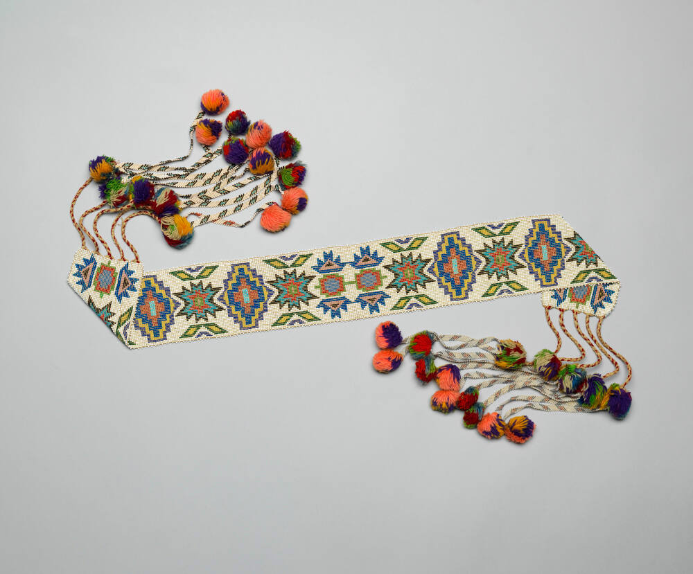 DescriptionLoom-woven belt on thread foundation with multicolored geometric design on a white background; suspensions at ends, each consisting of braided yarn with yarn pom-poms and a pair of beaded bands.Published ReferencesTorrence, Gaylord, ed. Continuum: North American Native Art at the Nelson-Atkins Museum of Art. Kansas City: Nelson-Atkins Museum of Art.