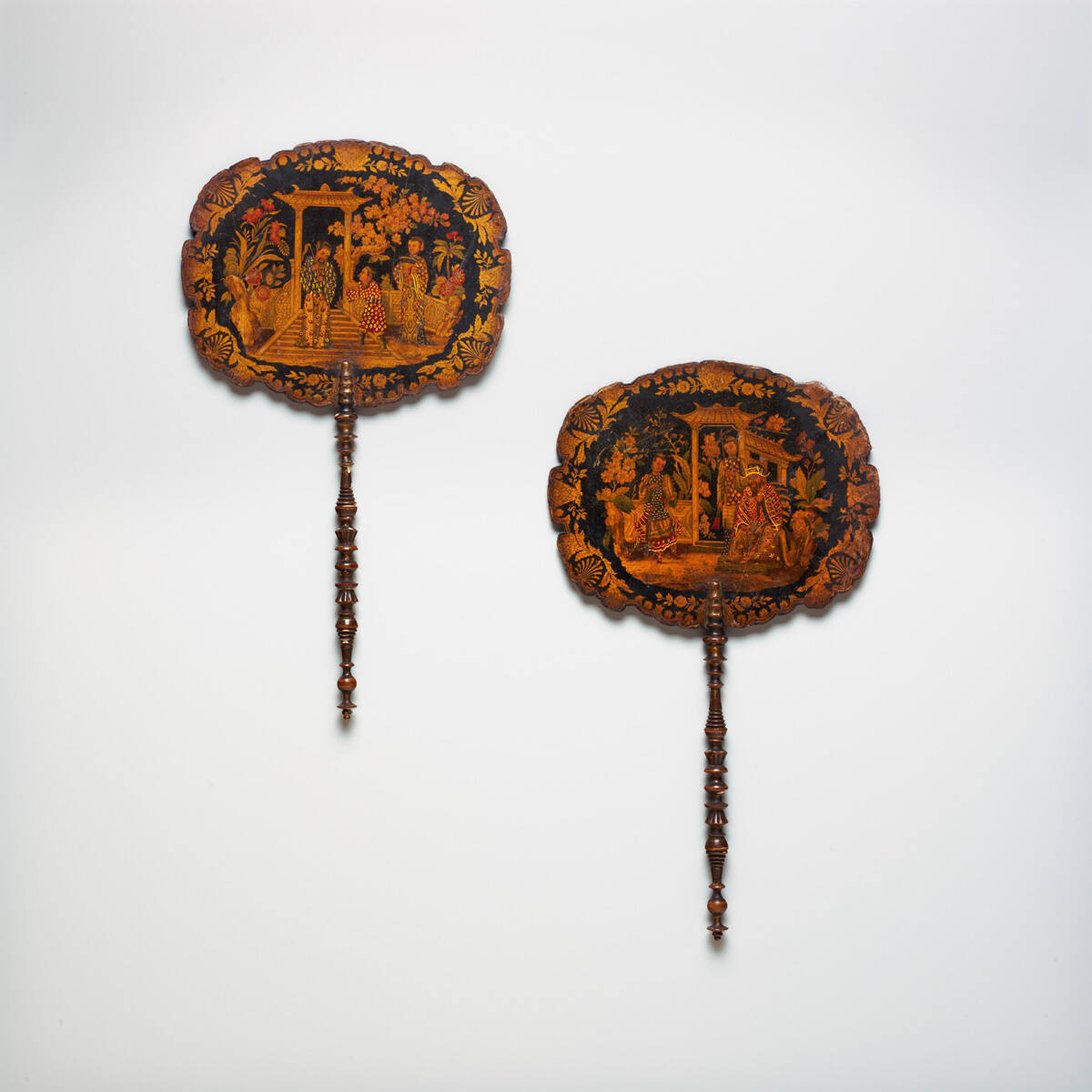 DescriptionScalloped-edged pressed paper fiberboard oval attached to lathe-turned wooden handle. The screen element is decorated with Chinese-style scenes of figures in an architectural setting in gold and red on a black background. The border of the screen is stenciled with western-style flowers, palmettes and foliage. The verso is painted red. The handle is painted black with gold highlights.