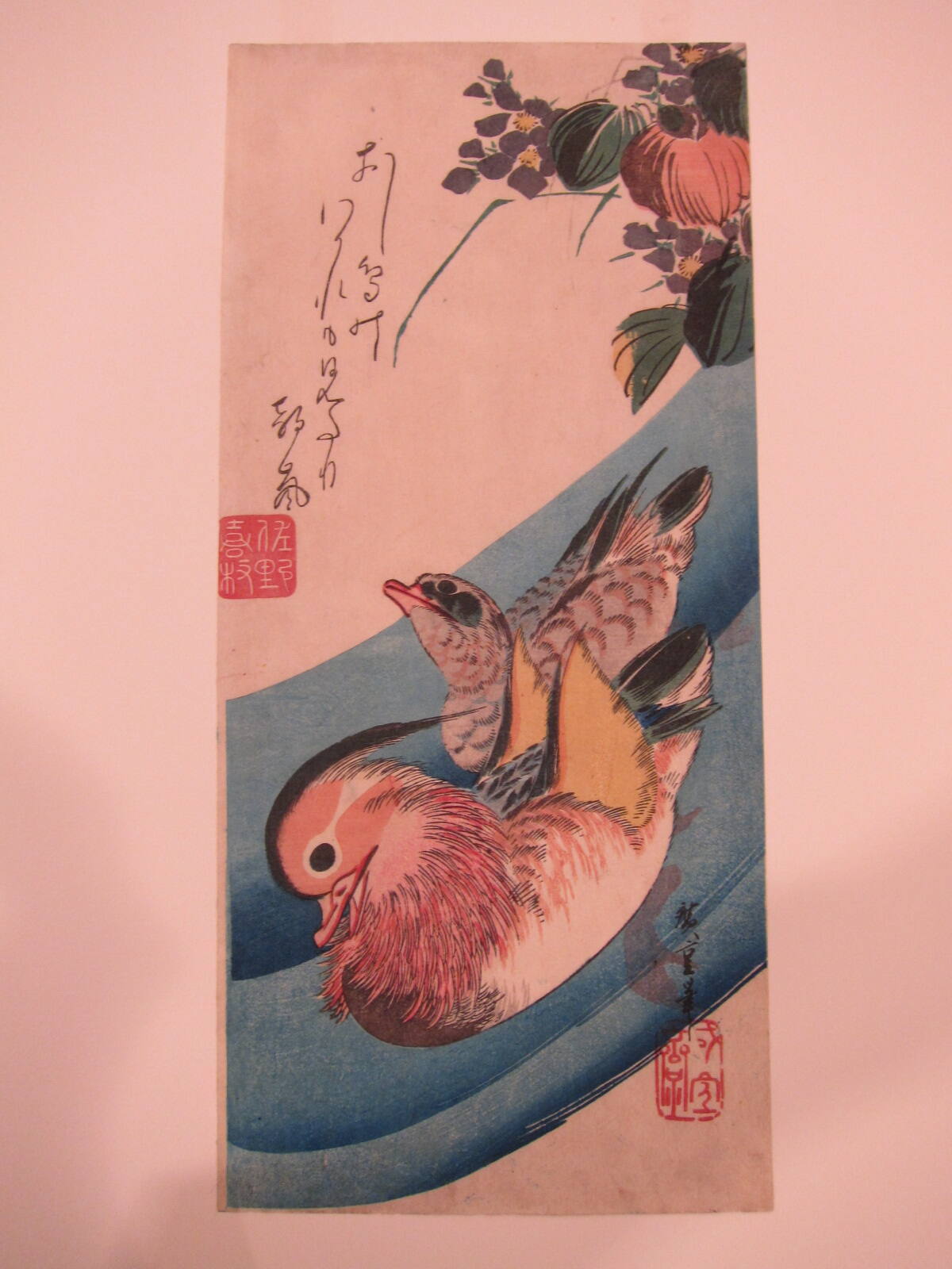 Mandarin Ducks Swimming under Bell Flowers