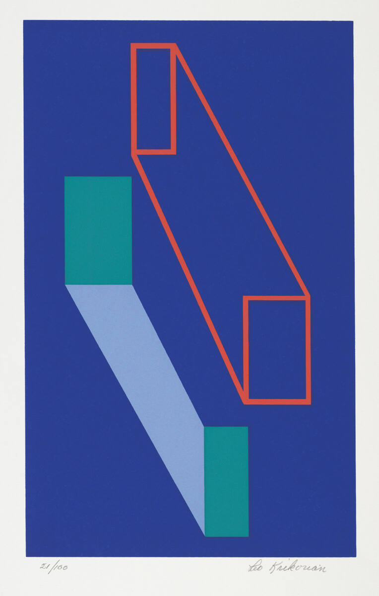 DescriptionTwo geometric "rectangular" forms, one depicted as an orange outline and the other as a light blue shape with green ends, float on a ground of royal blue.Copyright© Leo Krikorian Estate