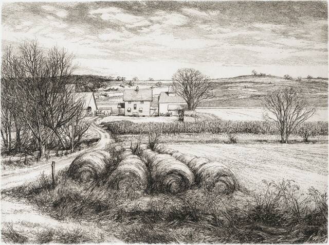 DescriptionBeyond plants in foreground, four rows of round bales of hay along road, left, trees beyond to left margin. Empty field, right, with tall tree. Center, beyond fence, a barn, house, and buildings, with one tree; rolling land in background with clearing sky and clouds above.Copyright© Doug Osa