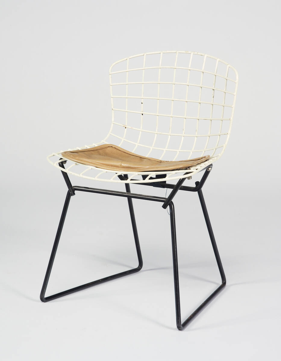 DescriptionThe upper section of the chairs is formed by vertical and horizontal ribs which are contoured to accomodate the curves of the human body. The ribs are covered with white plastic coating. The base of the chairs is formed by round tubes coated with black plastic. The chair pad is made of foam and covered in Naugahyde with a black textile backing. The chair cushion is not attached to the chair. Two chairs have orange chair pads, three have beige chair pads and the other chair does not have a chair pad.Copyright© Estate of Harry Bertoia / Artists Rights Society (ARS), New York