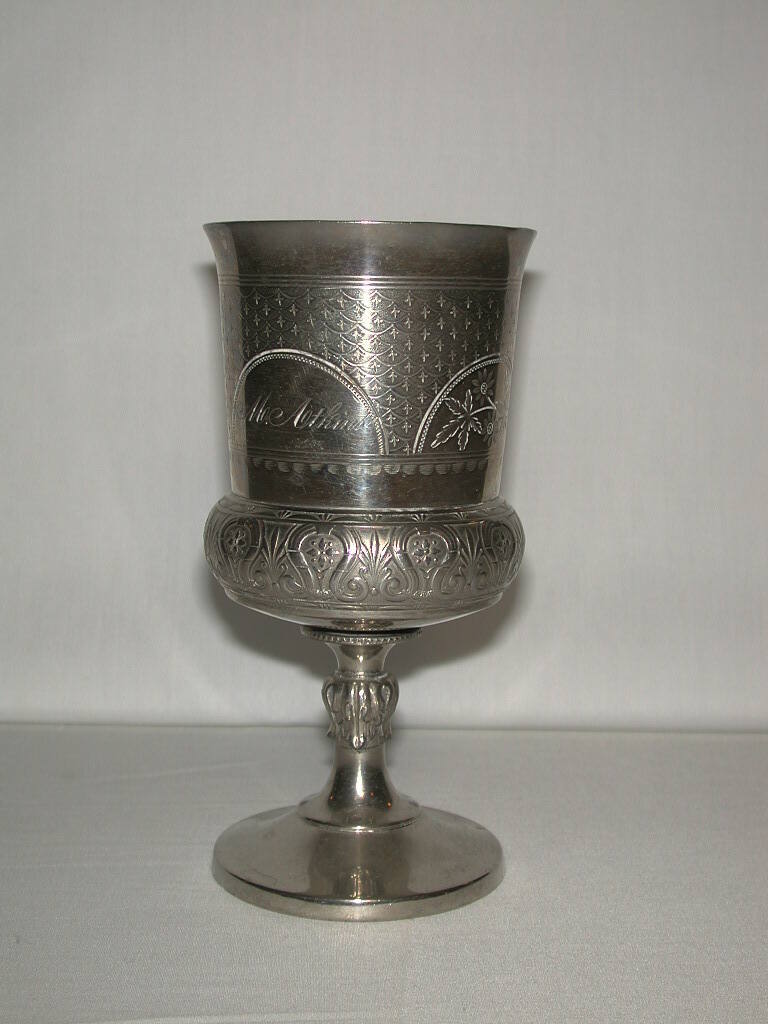 DescriptionThe cylindrical bowl of the goblet rests upon a turned stem and circular base. The top of the bowl flares outwards and the bottom of the bowl is formed with a wide roll that is decorated with ornamentation very similar to that of the tray's. The surface of the center of the goblet's bowl is decorated with an all-over, small-scale pattern very similar to that of the tray's. The all-over patterning is interrupted by semicircular panels of polished silver. "M. Atkins" is engraved in the center of one of the panels.