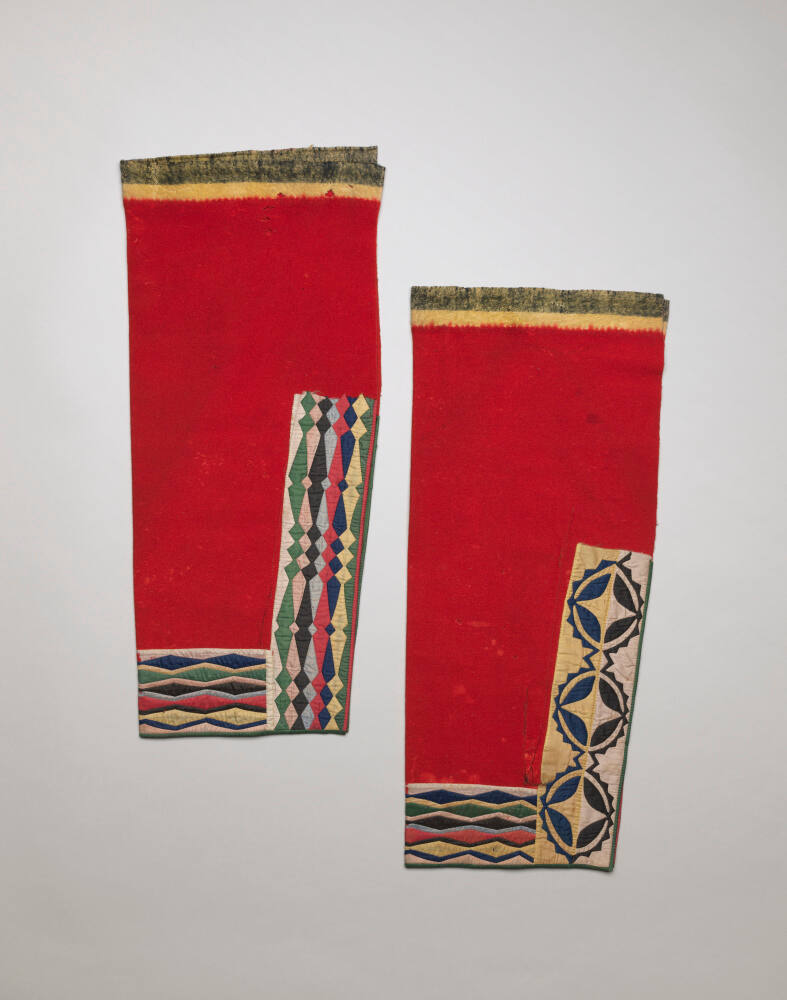 DescriptionPair of red wool leggings decorated with silk ribbon appliqué running vertically along the outer edge, both front and back, and across the bottom. Designs include diamong motifs and abstract patterns.