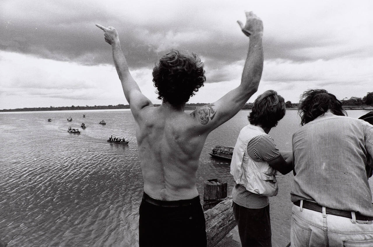 DescriptionShirtless tatooed man with back to camera overlooking water with canoes and two camera crewCopyright© Beat Presser