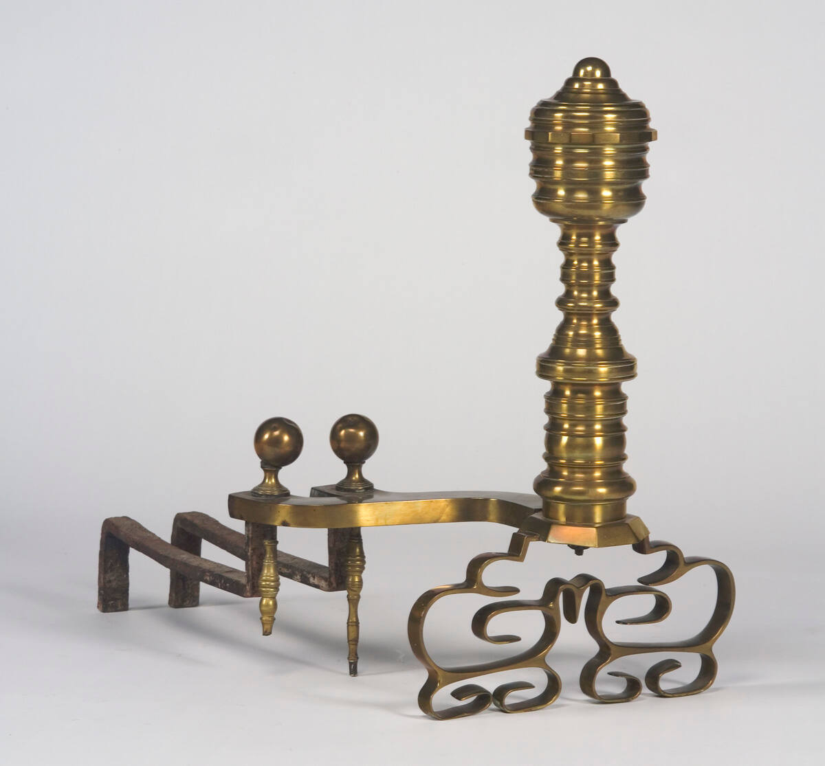 DescriptionLarge brass ball on top front side. Flat brass bar to hold the logs.ProvenanceProbably William Rockhill Nelson (1841-1915), Oak Hall, Kansas City, MO, by 1915 [1];