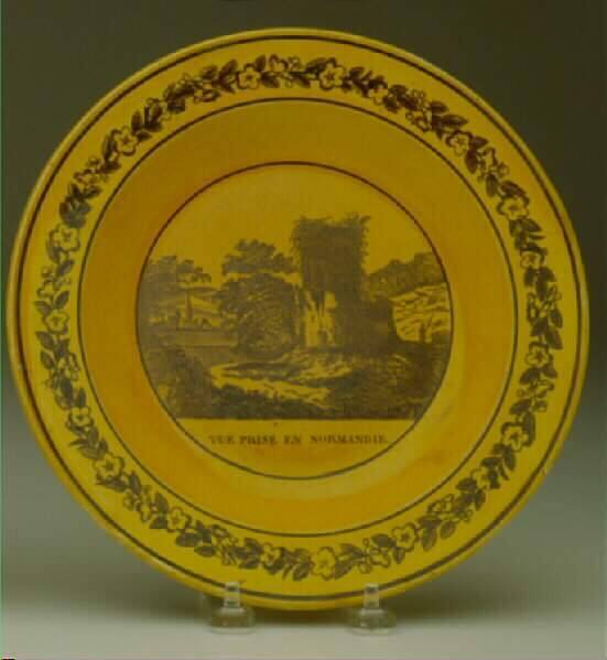 DescriptionTransfer printed in black with two French views: "Vue de Chatillon" and "Vue Prise en Normandie" with floral decorations on brim.