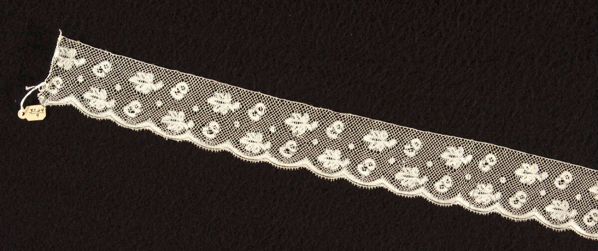 DescriptionBobbin-made straight lace of the Valenciennes type. Square plaited mesh and whole stitch pattern. Shallow scalloped lower edge. Two rows of ill-defined leaves and flower heads above.Provenance