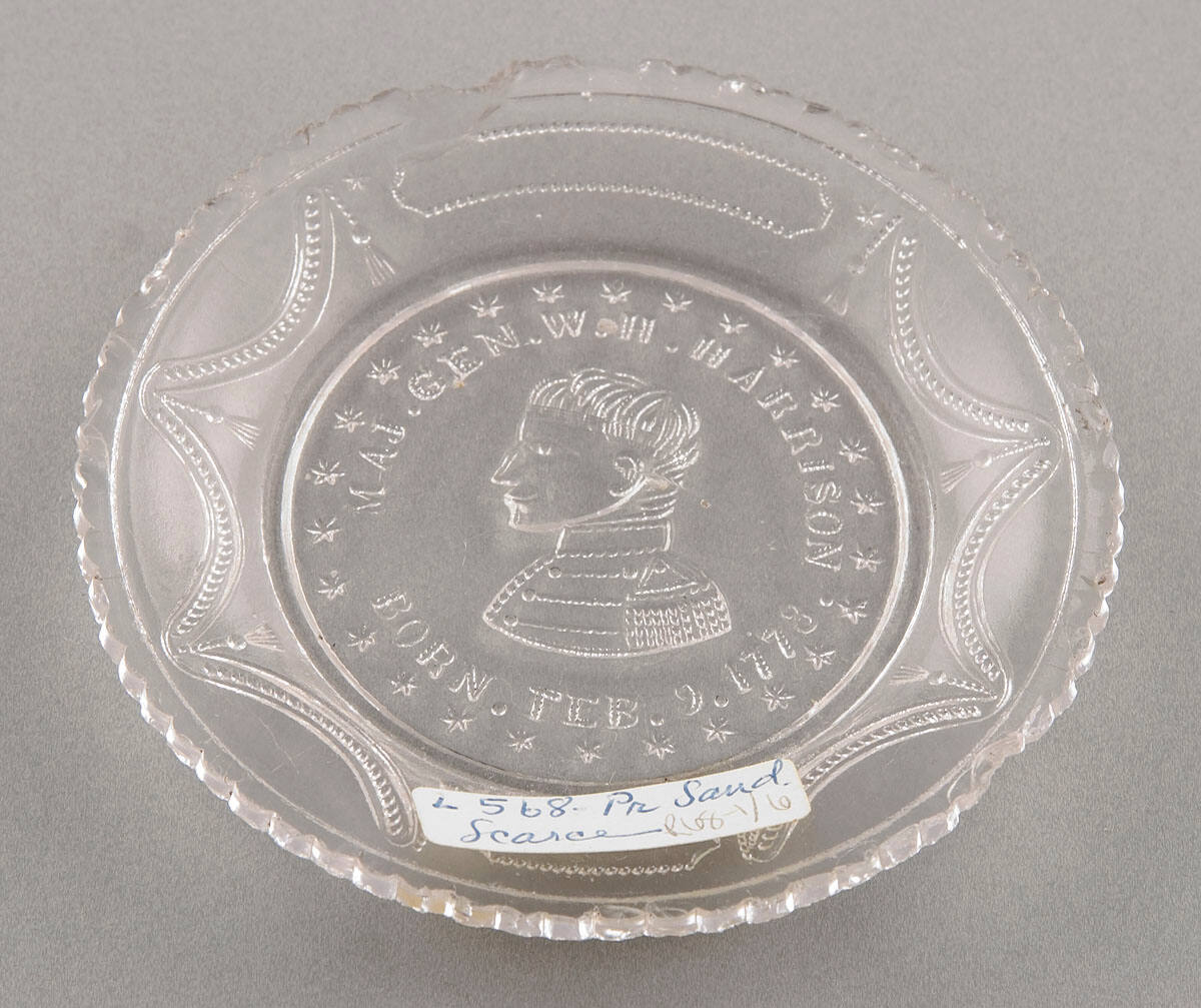 MediumPressed glass cup plate with bust of William Henry Harrison in center