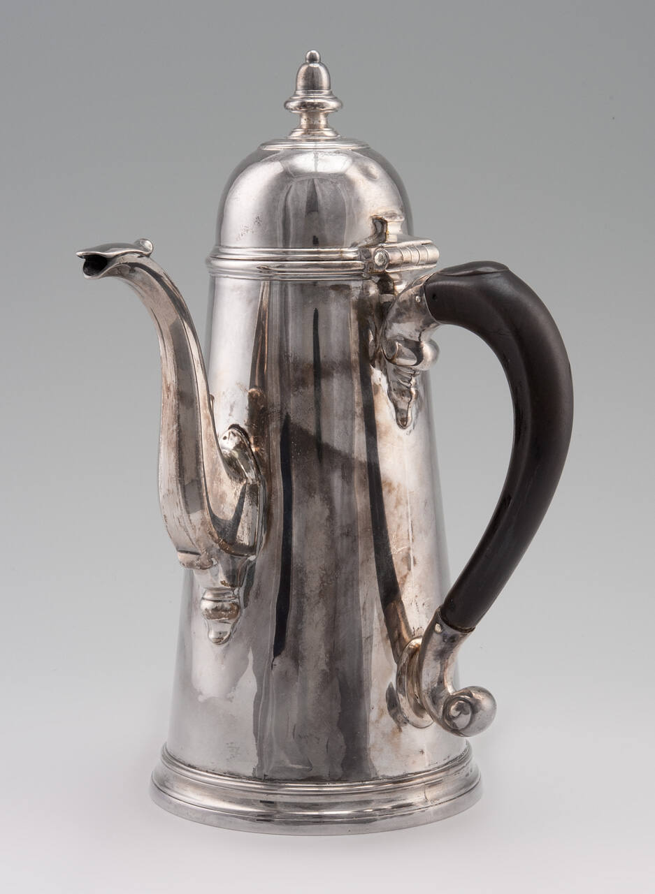 DescriptionSilver coffee pot with a tapered body that is plain except for an engraved coat-of-arms. The domed cover is hinged and surmounted with a plain turned finial. The spout is positioned at 90 degrees from the curved boxwood handle.