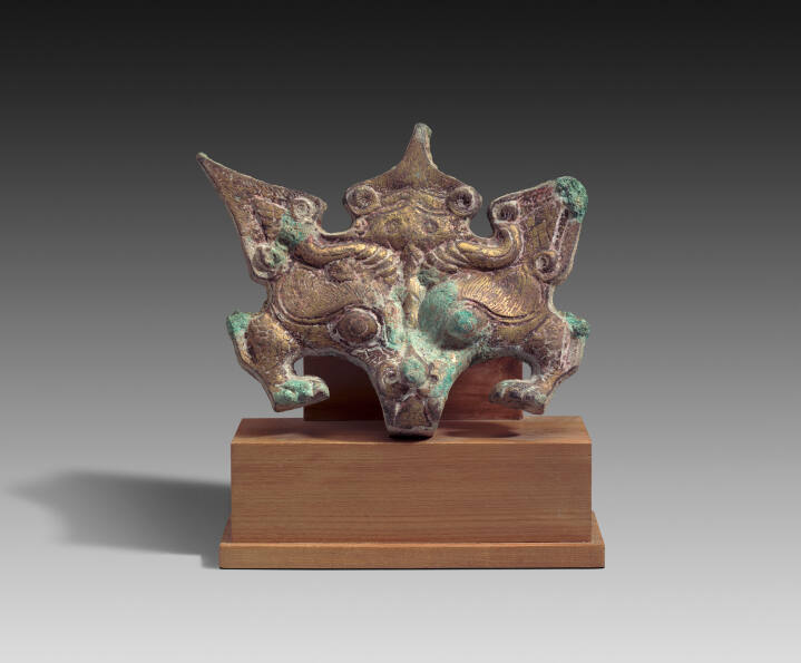 DescriptionOrnament in the form of a T'ao T'ieh mask with short legs on either side. Two bronze extensions at back for inserting in wood. Traces of heavy green patina.