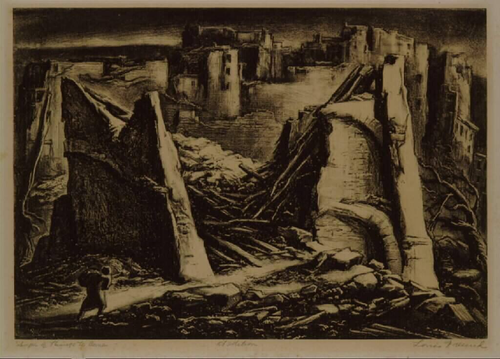 DescriptionImage depicts ruined city walls and the city beyond as well as a gnarled, leafless tree. A lone figure carrying a bundle over its shoulder walks toward the city along the brightly-lit diagonal of a country road.Copyright© Louis and Elsie Freund Estate / Jerry Bedford