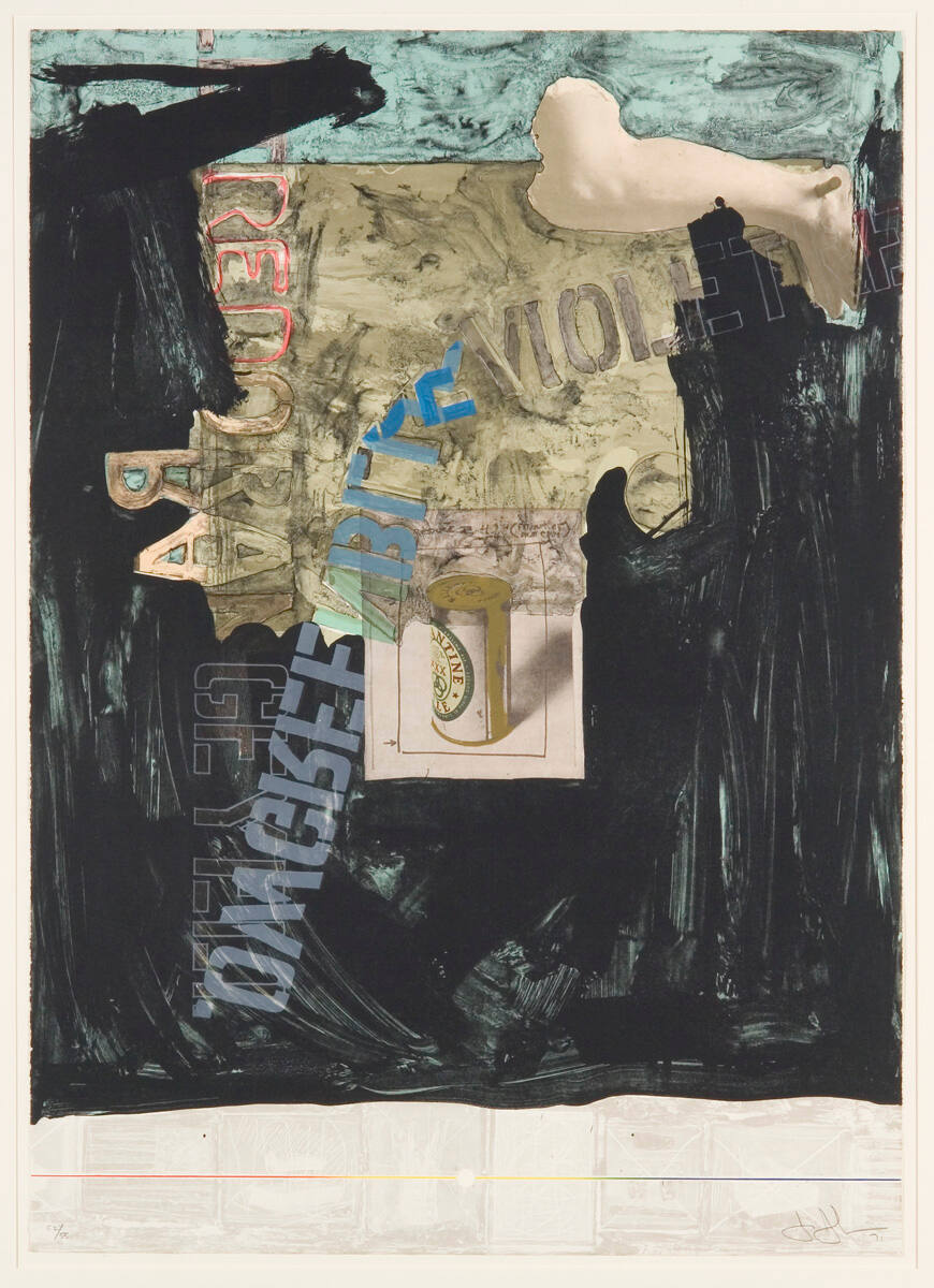DescriptionBottom, pale grey impressions of eight cancelled photoengravings bisected horizontally by spectrum line pierced by round hole, center. Scrubbed black area over green, left, right, and margin (?), bears Ballantine ale can on square tan reserve. Center, topped by instructions in script. Yellowish area above, blue-green section, top. Color names in mirror images, left, extending into work "Violet", upper right, below wax cast of leg (to just above knee) (Barbara Rose's) with bolt through ankle.Copyright© Jasper Johns / Licensed by VAGA at Artists Rights Society (ARS), New York
