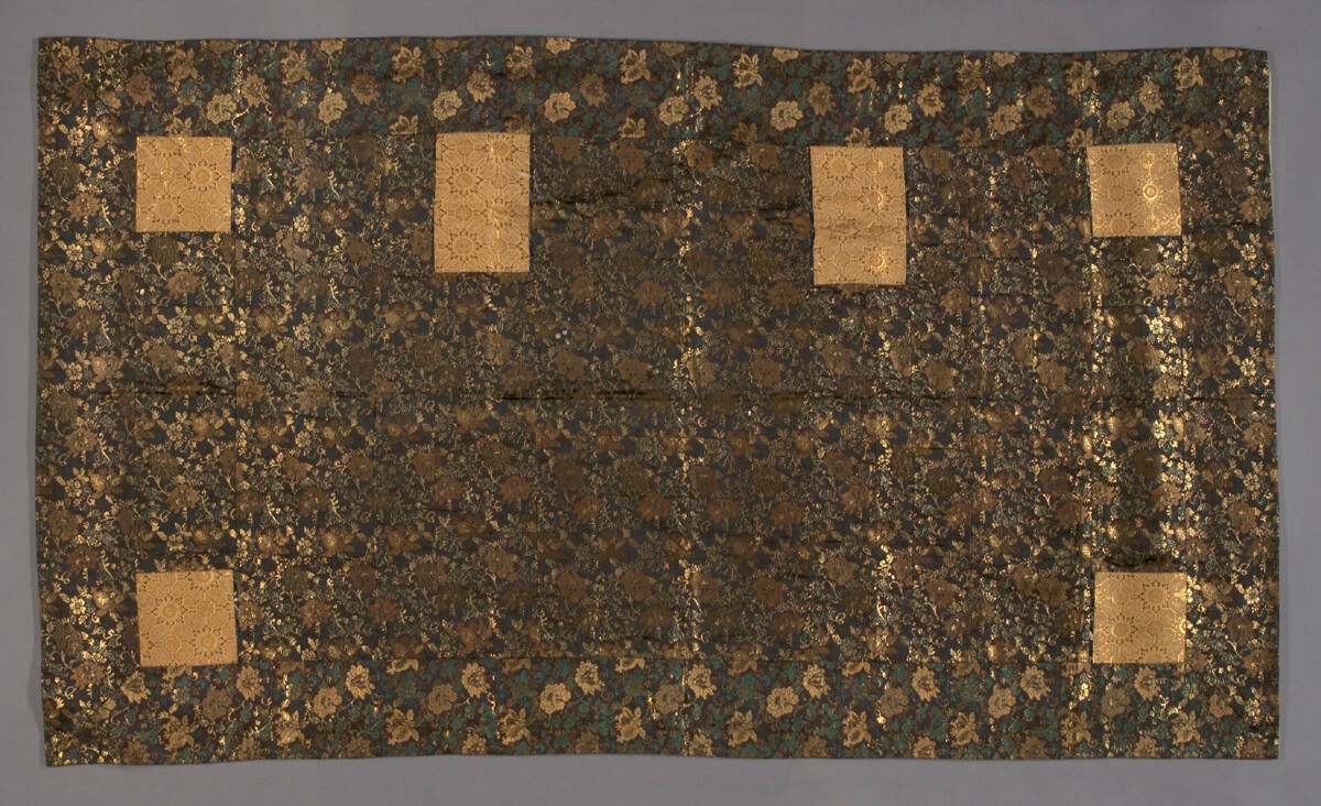 MediumDark brown ground silk brocade with gold-leaf wrapped around paper threads, white brocade silk twill lining