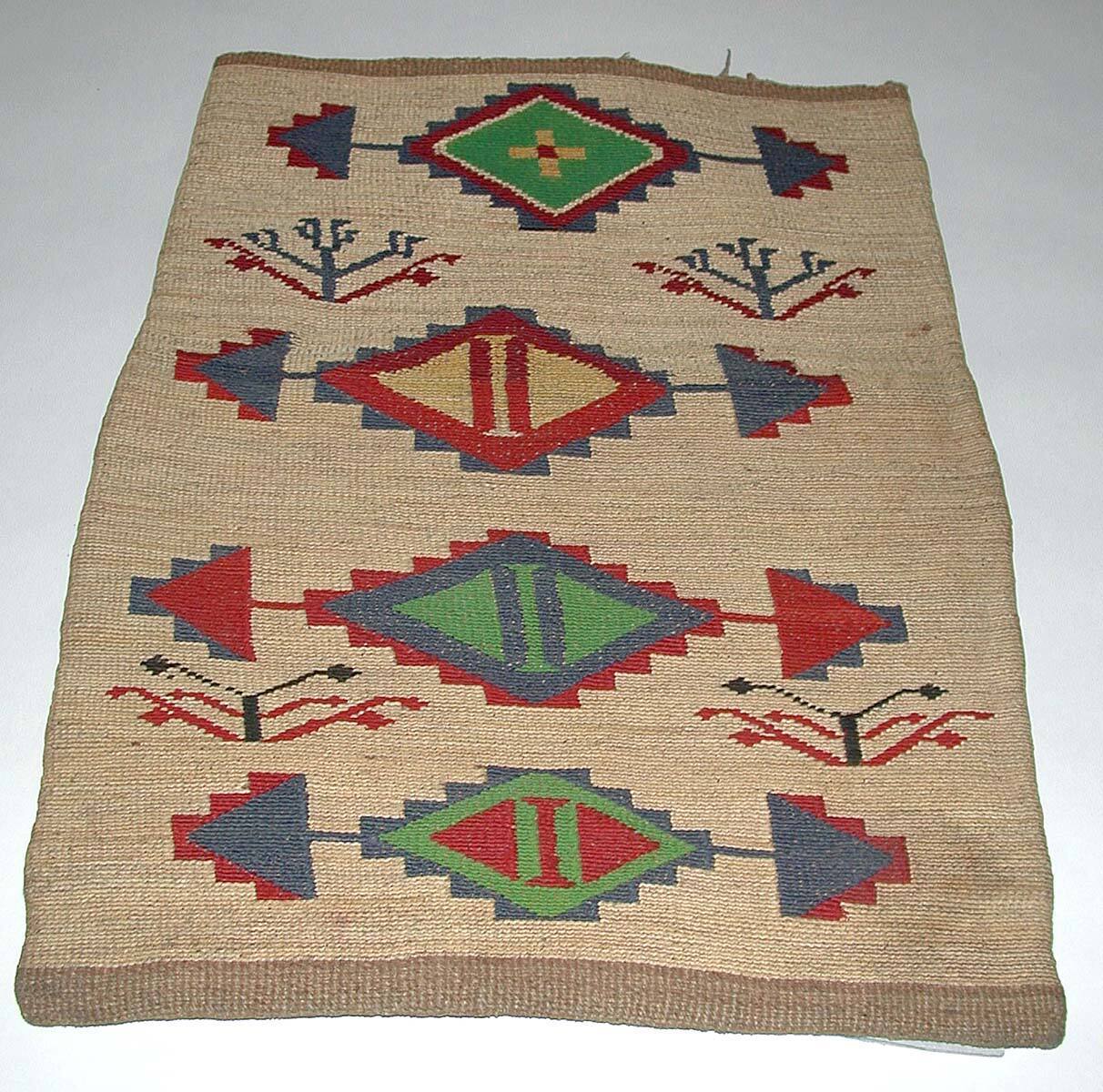 DescriptionLarge bag woven in natural color. Triangular designs in red, blue, and green.