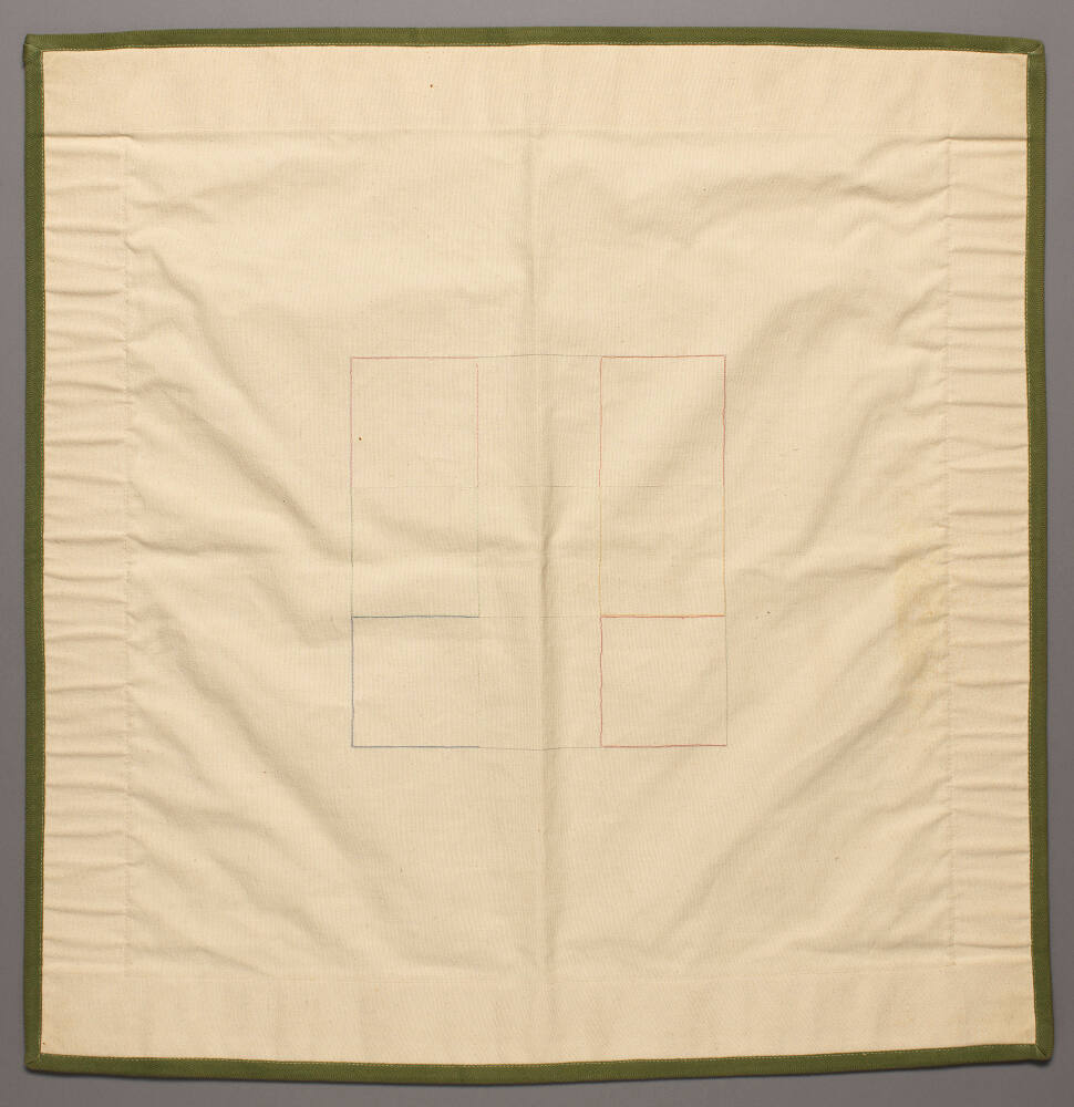 DescriptionOff-white canvas square. Seam on all sides approximately 2-1/2 inches from edges. Green edging also on all sides. In center of square is another square which is equally divided into nine smaller squares by red, gray, yellow, green, blue, and white thread.Copyright© Alan Shields Estate