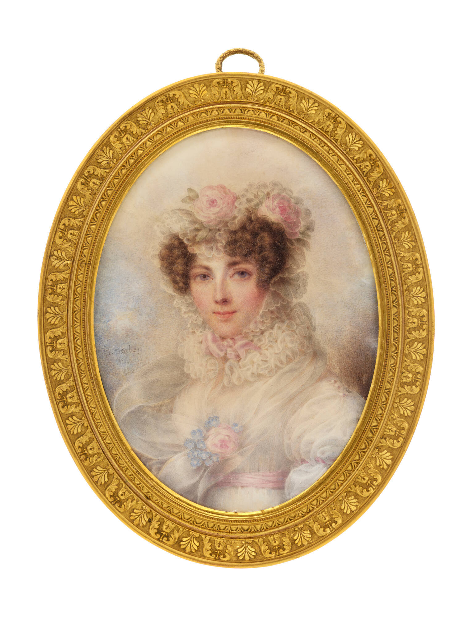 [2] The miniature is illustrated as lot 242 of the Levaigneur sale and described as “Grande miniature ovale: Portrait de femme, en buste, vétue de blanc, portant une ceinture rose, coiffée d’un bonnet tuyauté orné de deux roses, par J. Isabey. Signée.”