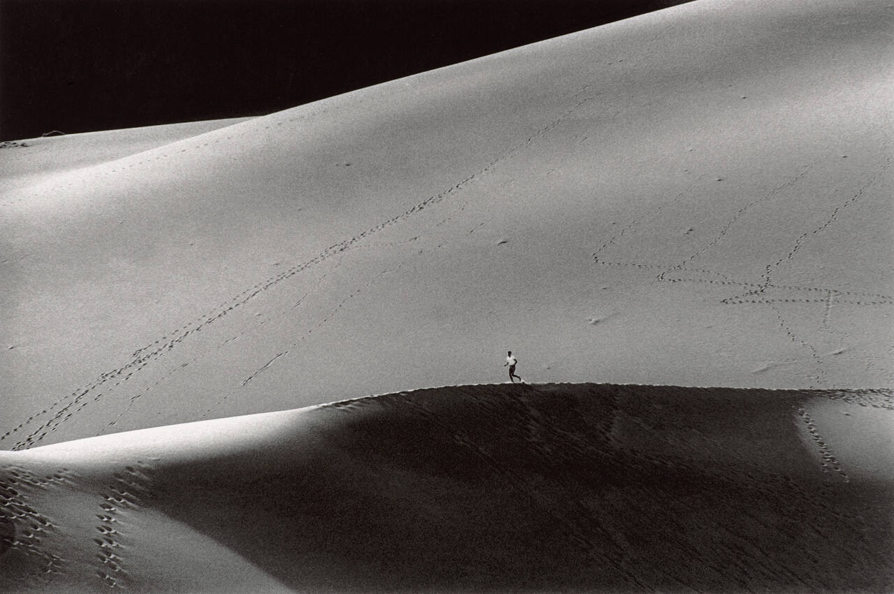 DescriptionIn altitude training for the 1968 Olympics, the lone runner (Jim Ryun) appears miniscule against a massive sun-saturated sand dune in the Great Sand Dunes of Colorado, as he runs across the shadowed ridge of another dune in a path which travels toward the left side of the composition in the lower third of the image. The runner's path will eventually intersect with a sunny patch where converging footprints dot the surface of the dunes.Copyright© Rich Clarkson