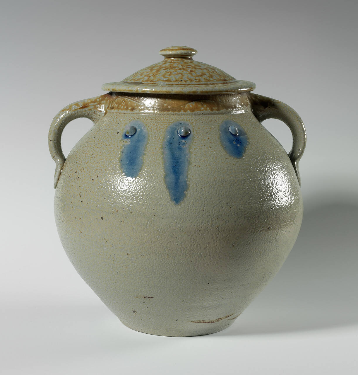 DescriptionSalt-glazed stoneware globular jar with lid with two handles attached from the neck to the upper body. The deocration includes an incised wavy line around the neck of the vessel and three applied hemispheres of clay on each "side." Beneath the raised dots of clay on one side are two parallel lines of 6 tiny incised dots and on the other small circles of incised dots. This area is then covered with splashes of blue glaze. On one side of the vessel is a large burn mark from the wood-fired kiln. There are splashes of iron reddish brown around the neck and tops of the handles. The lid of the pot is domed with a large overhanging lip, emphasized by an incised line, with the entire top covered with a salt glaze. The underside of the lid is glazed only on the lip.Copyright© Mark Hewitt