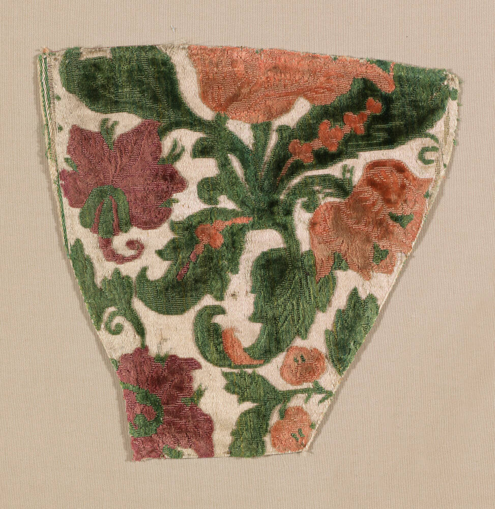 DescriptionCream background, leaf and flower design in green, lavender, and apricot.Gallery LabelSilk velvets, such as those shown here, are often referred to as jardinière velvets, alluding to the textiles' bold, symmetrical floral patterns, found in French gardens of the period. These polychrome velvet designs required as many extra sets of warps as colors in the pile. In the fragments displayed here, probably from clothing or upholstery, each design has three colors of velvet pile on a cream satin background. Jardinière velvets usually combined both cut and uncut loops, a technique known as alto basso in Italian, which added texture to the design. In these examples, the combination of cut and uncut velvet on a smooth satin background gives them an especially rich appearance as light plays across the surfaces.