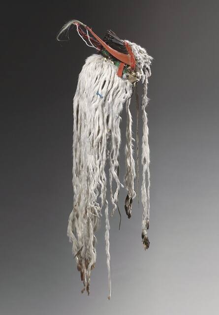 MediumNative tanned leather, mallard duck scalp, eagle, raven, and crown feathers, rabbit skin (?), horsehair, wool cloth, native pigment, cow horn, and glass beads