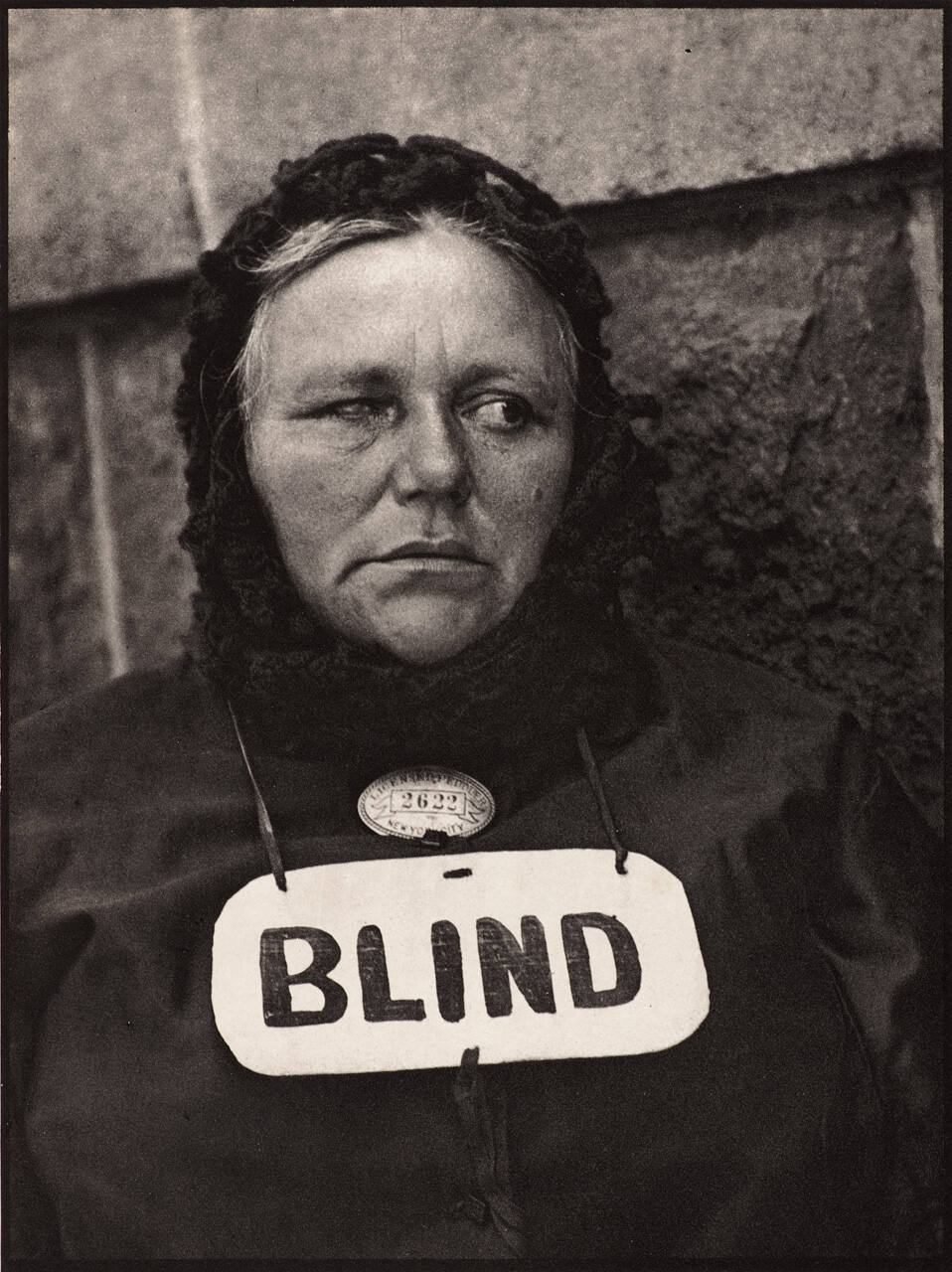 DescriptionImage of a woman with a black scarf wrapped around her hair; she is wearing a sign with the word "Blind" printed on it in bold letters.Exhibition History20th-Century Photographs from the Hallmark Photographic Collection. Sioux City Art Center, Sioux City, IA, January 10 -February 22, 1981, no cat.