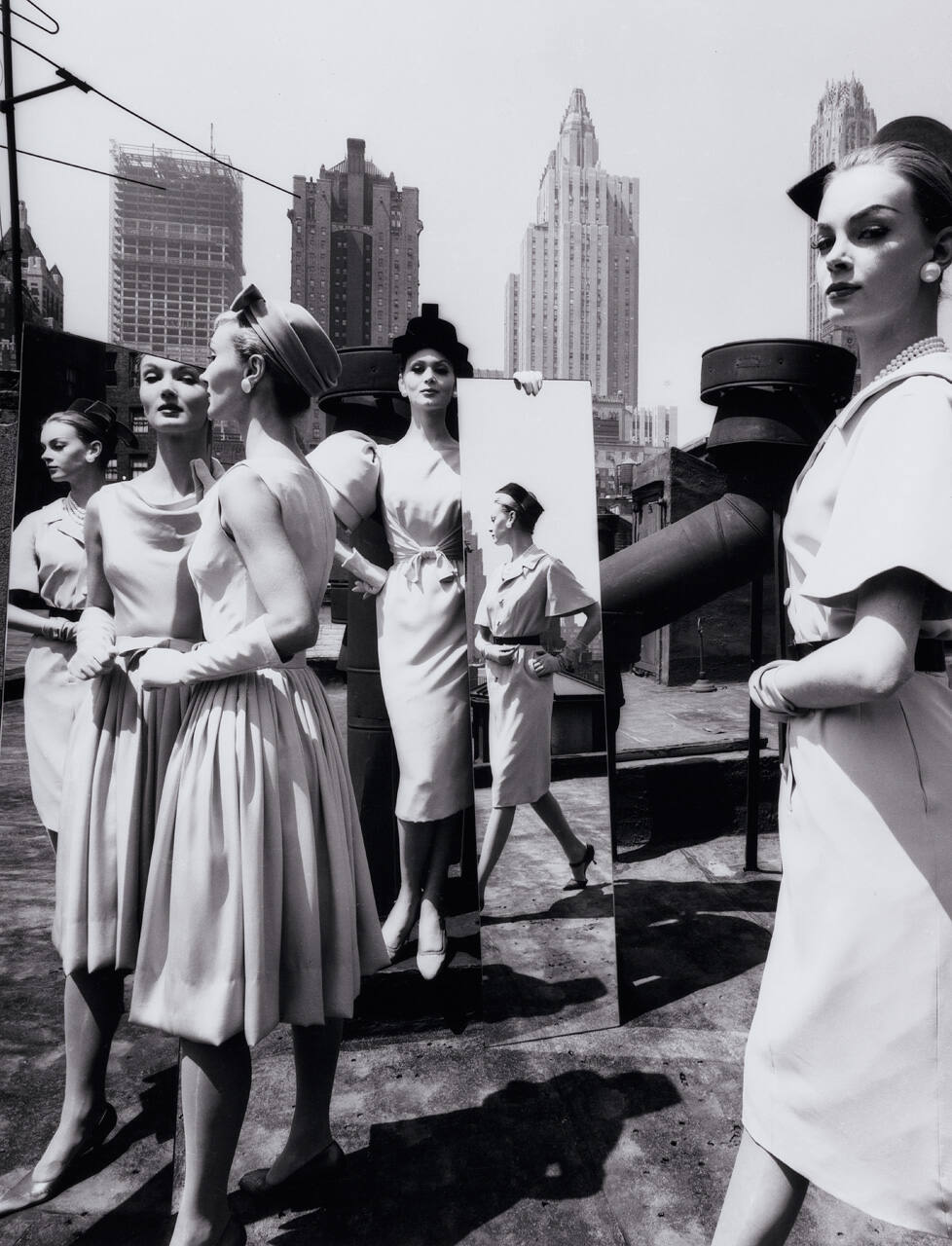 DescriptionGelatin silver print of women (and mirrors) on a roof in NY. Signature on back of print.Gallery LabelWhile working as a fashion photographer in the 1950s and 60s, William Klein produced innovative formal and conceptual images that pushed the genre beyond a rote recording of models and clothing. Here, Klein poses fashion models with rectangular mirrors to confuse spatial perception, creating a dynamic interplay between reality and reflection.
