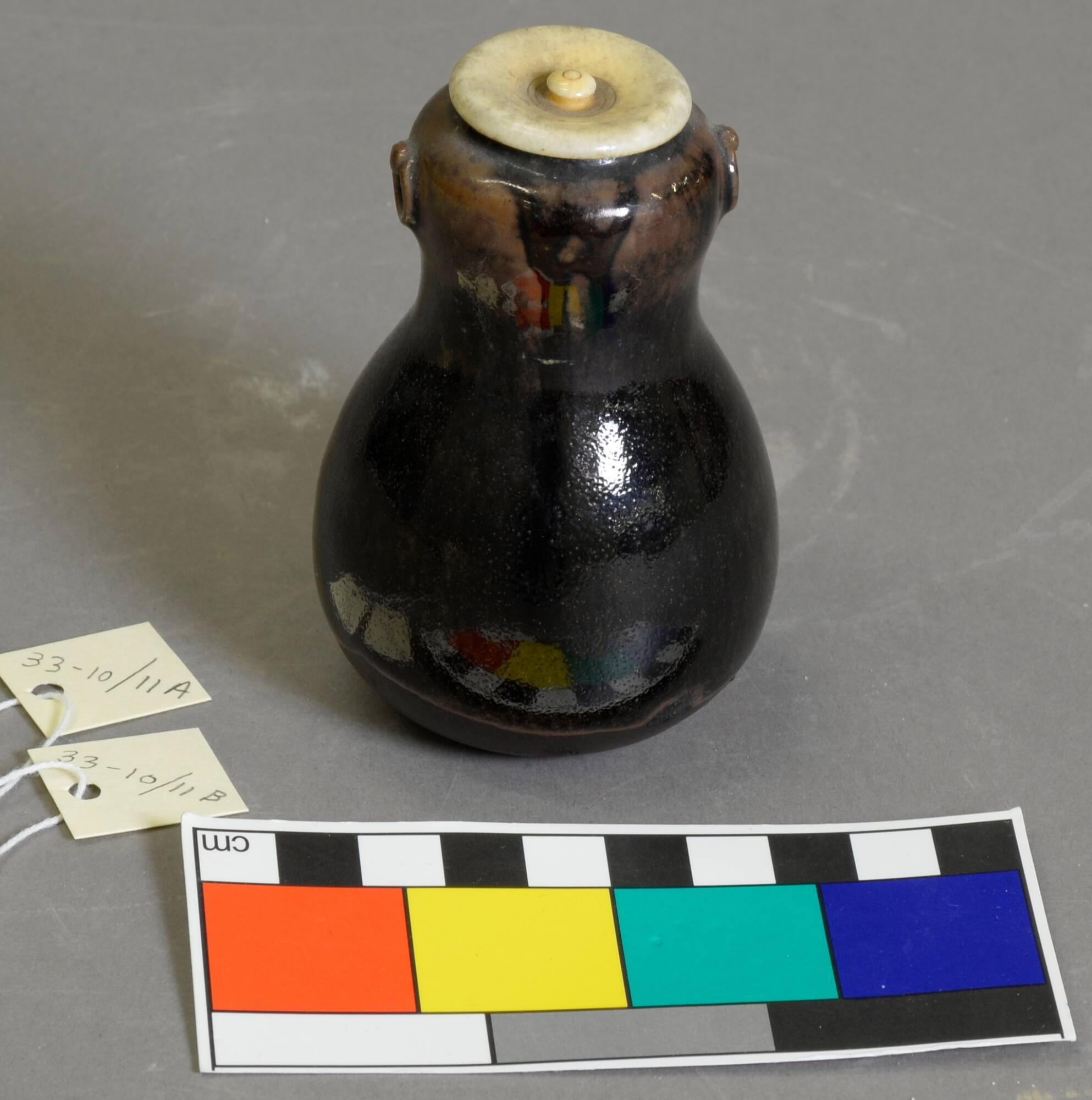 DescriptionGourd shaped tea caddy with ring marks on the shoulder, of dark brown clay with a light brown underglaze and glistening darker brown clouds. With a lid.