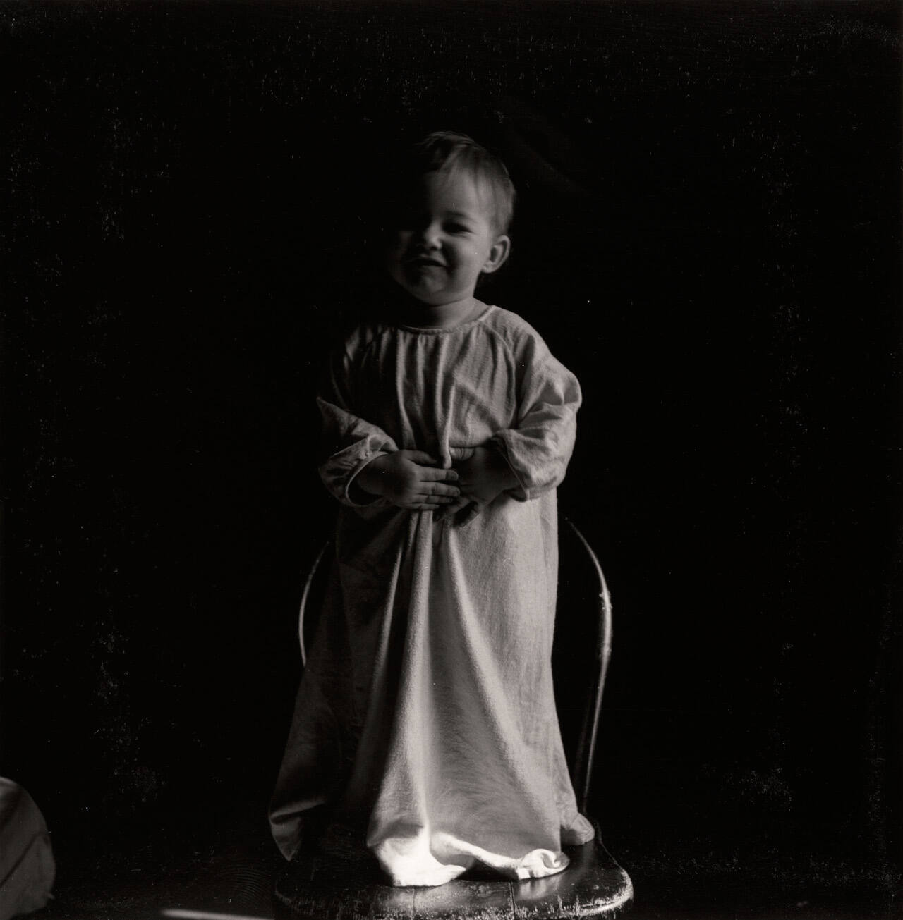 DescriptionImage of a young child wearing a nightgown as she stands on a chair. Light streams in from the right leaving the left half of the frame in darkness.Copyright© The Estate of Harry Callahan. Courtesy Pace Gallery, New York.