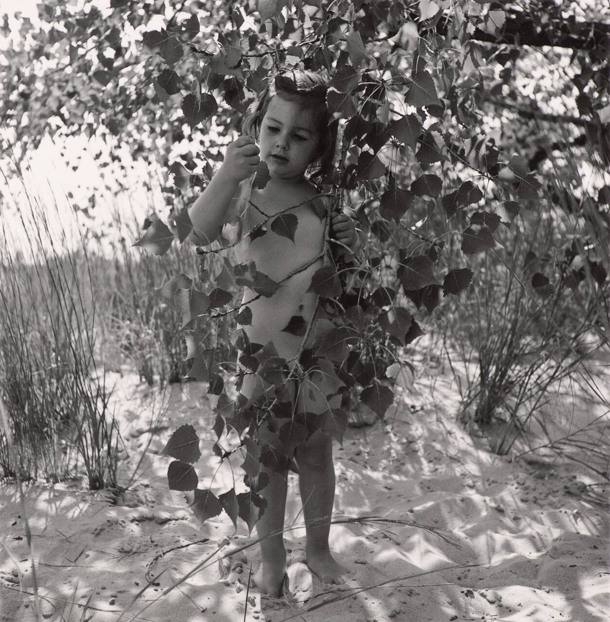 DescriptionImage of a nude child standing in a sandy landscape behind leaf-covered branches.Copyright© The Estate of Harry Callahan. Courtesy Pace Gallery, New York.