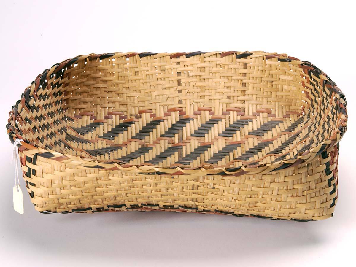 DescriptionSplit cane twilled basket, shallow with a roughly square mouth and rounded bottom, woven with three colors of cane in different diamond pattern or zig-zag designs.