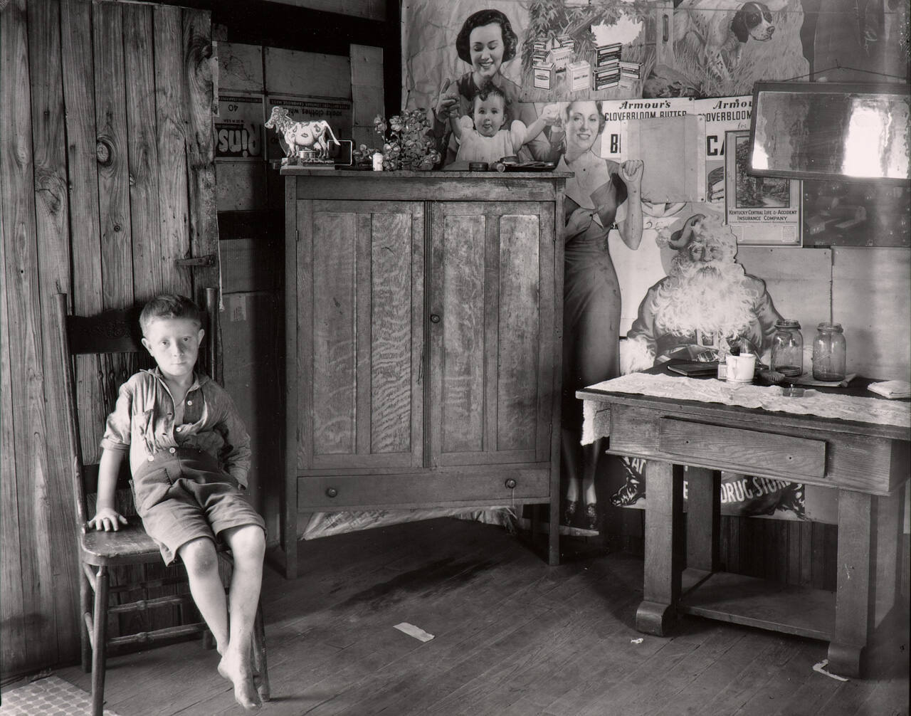 DescriptionPortrait of a young boy sitting on a chair in a sparse wood framed room. Two large pieces of wooden furniture in the center and right of frame. The wall on the right half of the frame is wallpapered in product advertisements.Exhibition HistoryMasters of 20th-Century Photography from the Hallmark Collection. Waterloo Municipal Galleries, Waterloo, IA, May 2 -June 13, 1982, no cat.