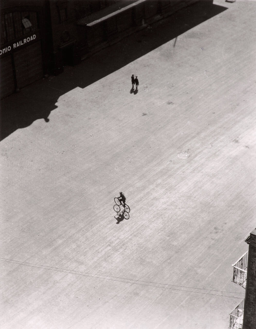 DescriptionAerial image of a figure riding a bicycle in the center of the street. Two other figures appear directly above the figure. The shadow of a building fills the upper left corner of the frame, and the metalwork of a balcony on a building are visible in the lower right corner.Exhibition HistoryCityscapes: 20th Century Urban Images from the Hallmark Photographic Collection. First Street Forum, St. Louis, MO, April 13 - May 20, 1984, no cat.