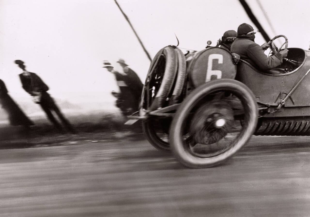 DescriptionImage of two figures traveling in a race car, marked with a 6, as they pass several people on the side of the track.