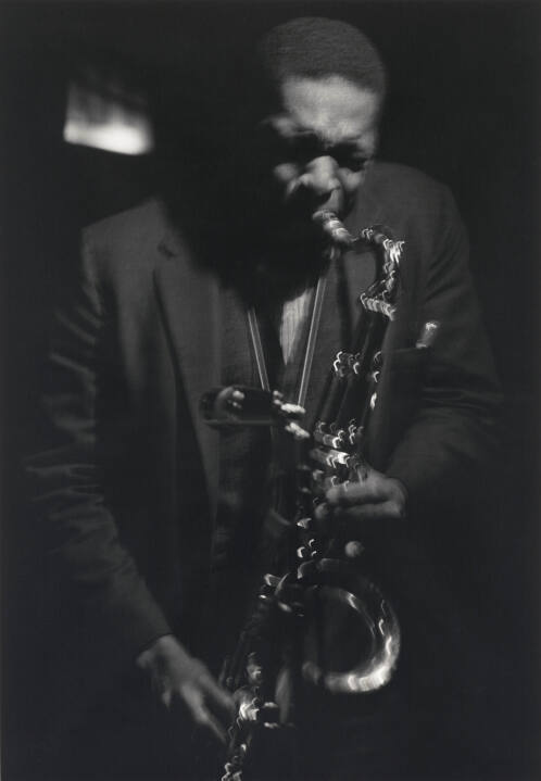 Drawn initially to painting and printmaking, Roy DeCarava turned seriously to photography in 1947. His photographs powerfully unite realist and expressive concerns, presenting familiar subjects in a visceral, psychologically charged manner. Here, DeCarava uses blur and underexposure to evoke the passionate intensity of John Coltrane's music. This image reveals DeCarava's love of the lower registers of the photographic scale: the velvety beauty of rich shades of gray and black.