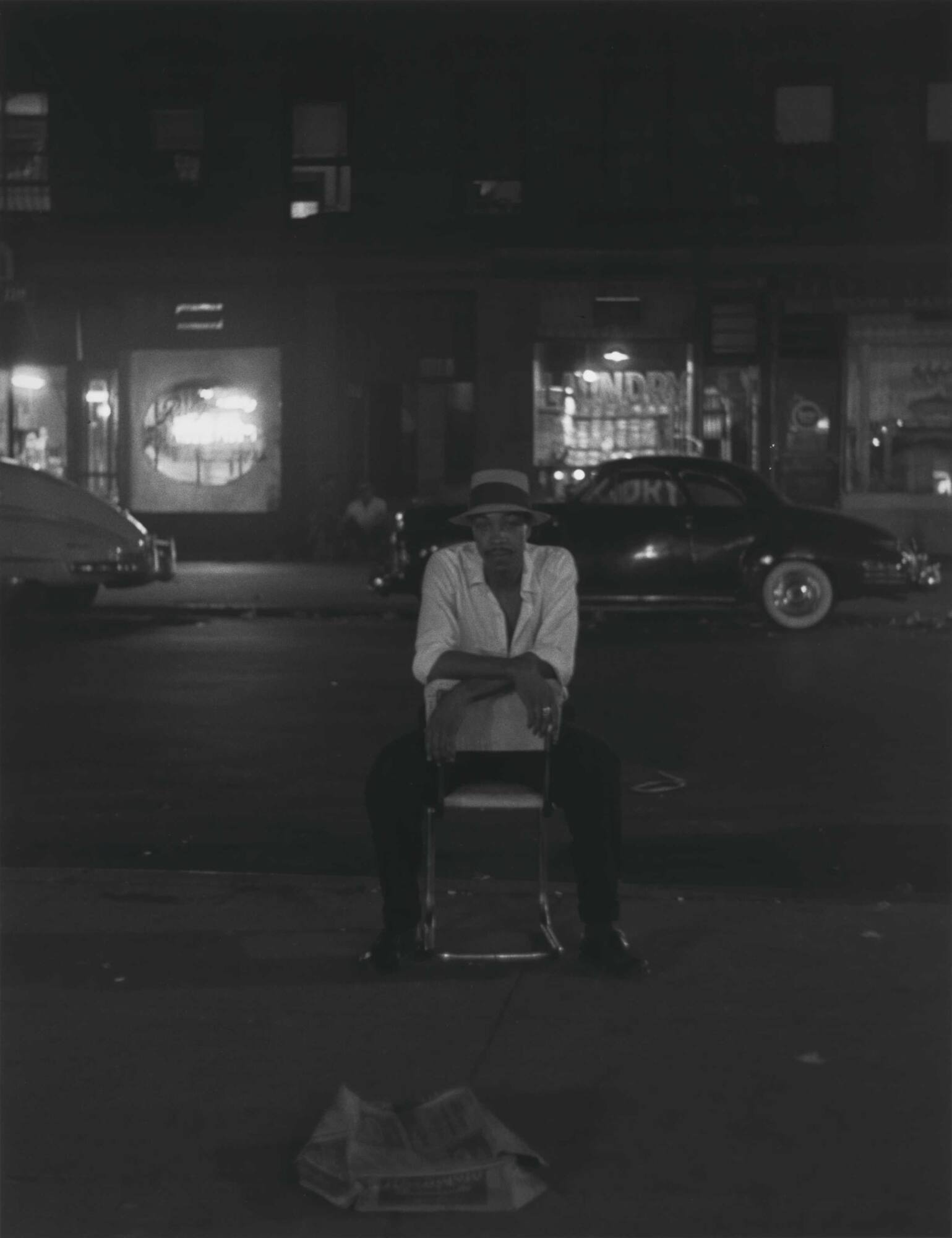 DescriptionDark image of a man seated backwards in a chair on the sidewalk with his arms loosely crossed. Neon lights in shop windows glow from across the street. The man wears a hat and an unbuttoned collared shirt.Exhibition History