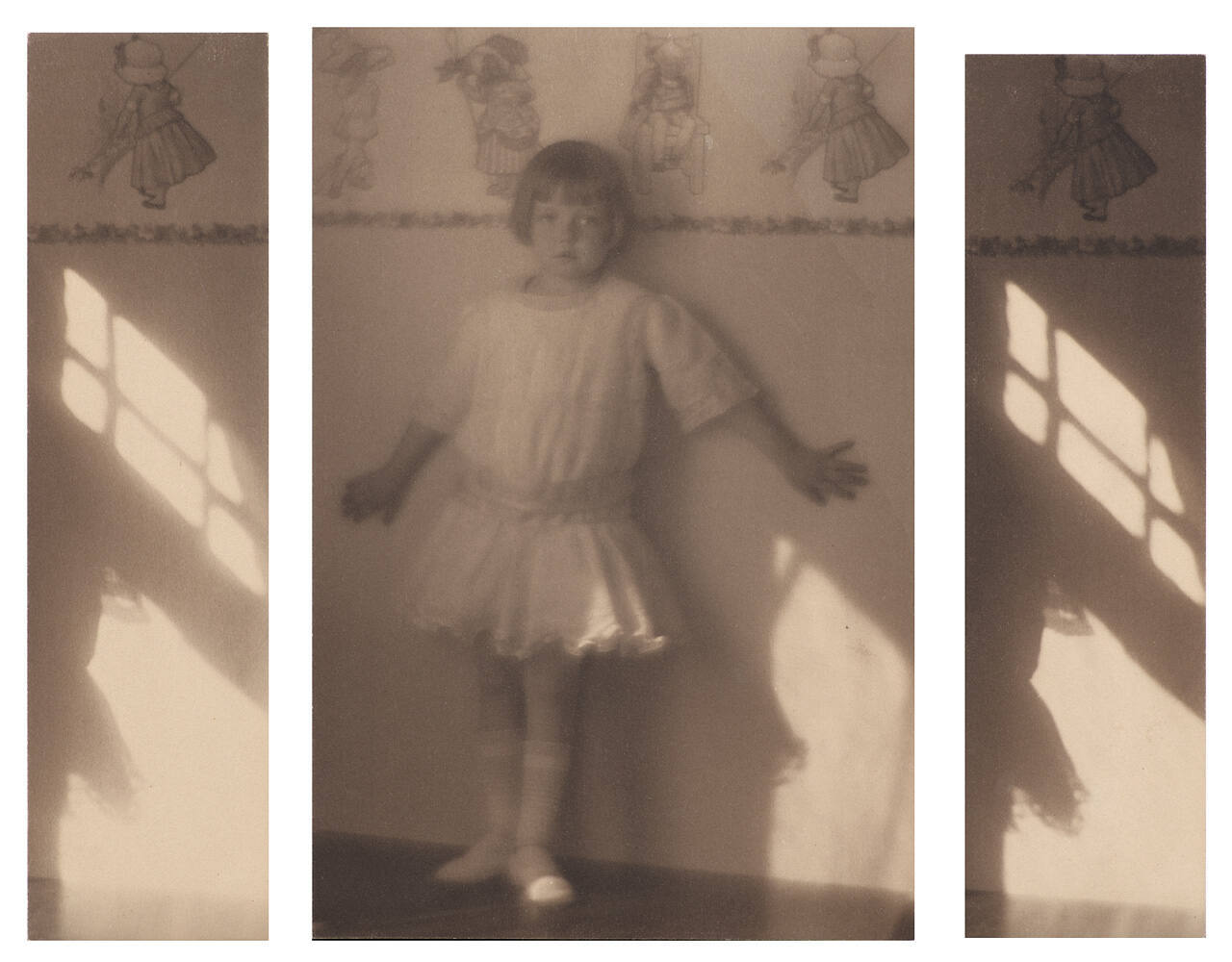 DescriptionTriptych image with center photo of a young girl standing against a wall. The two smaller side panels are photos of the same wall with light streaming in from the window panes.