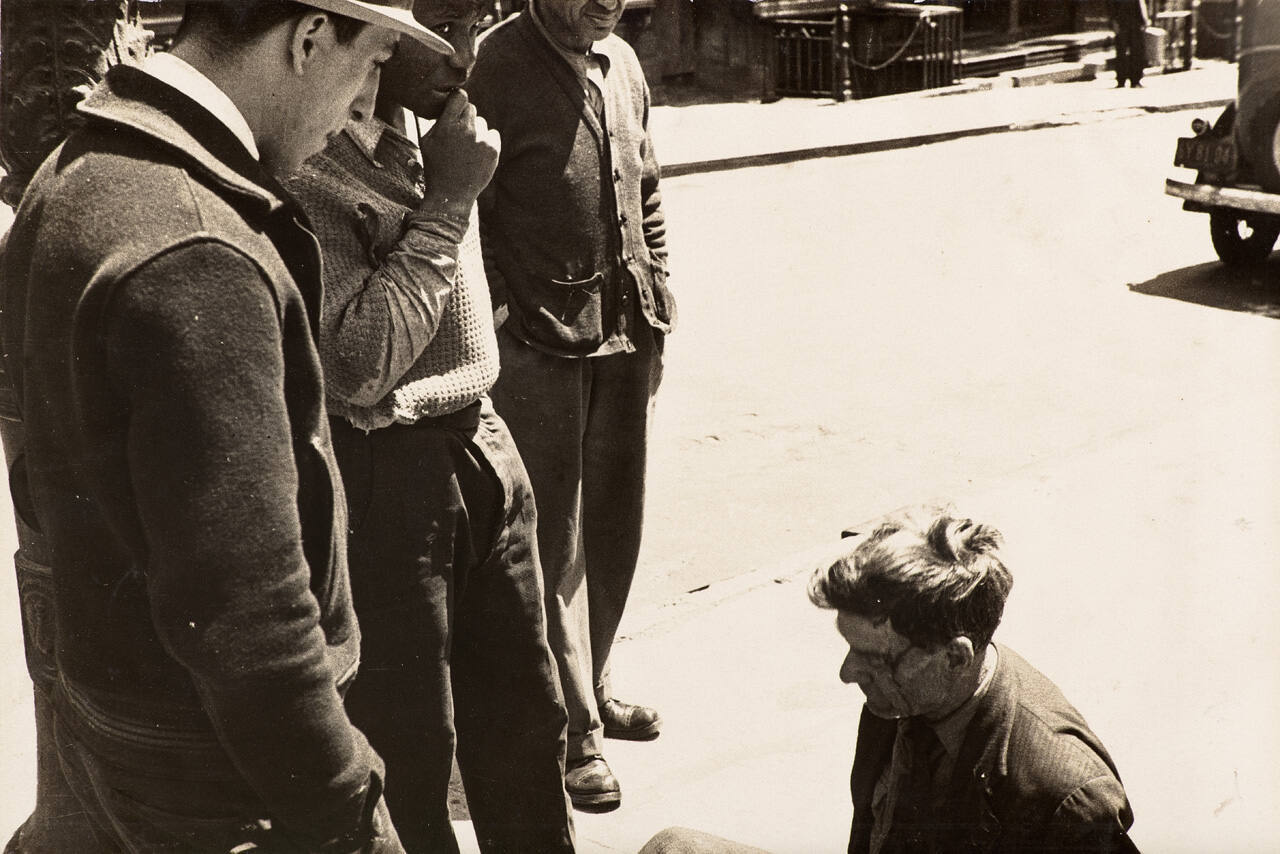 DescriptionVintage gelatin silver print, trimmed and mounted. Signature in ink on front of mount. Notations in pencil on back of mount. Image of three men standing in the street. (Another man is kneeling and appears to have blood running down his face.)Copyright© Estate of Ben Shahn / Licensed by VAGA at Artists Rights Society (ARS), New York