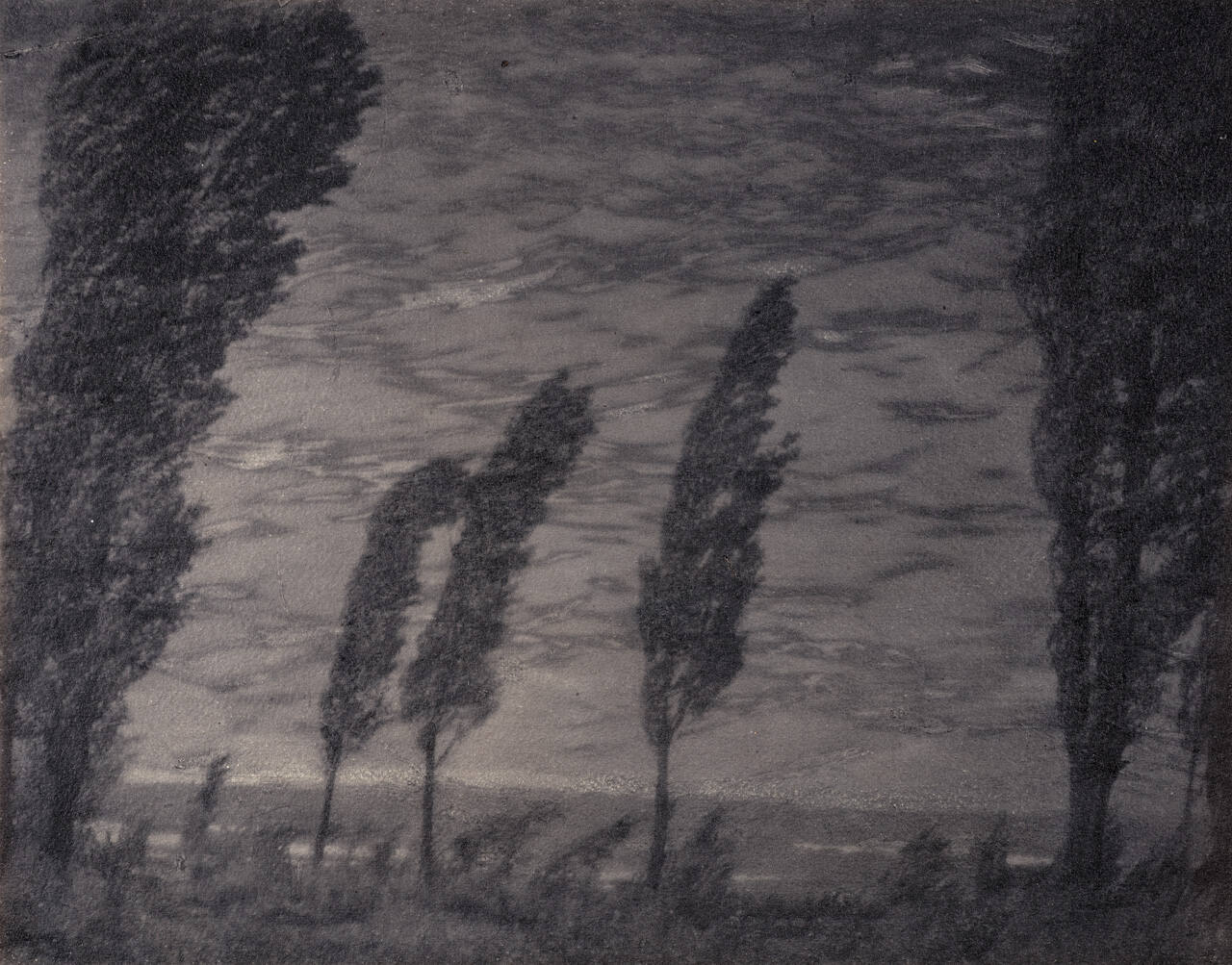 DescriptionVintage gum print on original exhibition mount. Title ("Watery Sky") written in lower left corner of mount. Image of trees blowing in the wind; cloudy ('watery'-looking) sky.