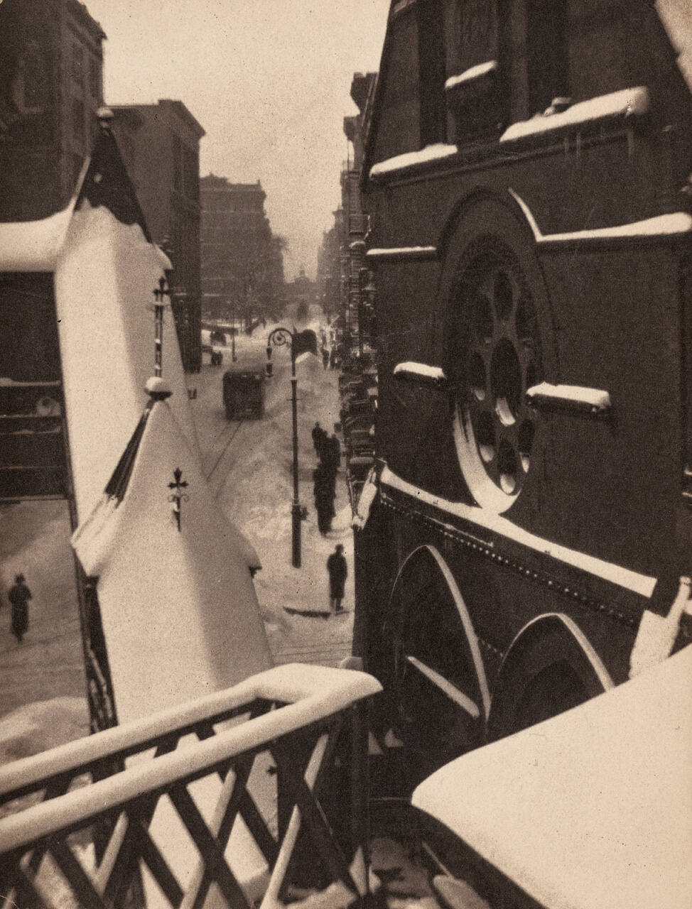 DescriptionImage of a snowy street scene taken from a high vantage point. A thick layer of snow is gathered on the railings which overlook a street lined with tall buildings.