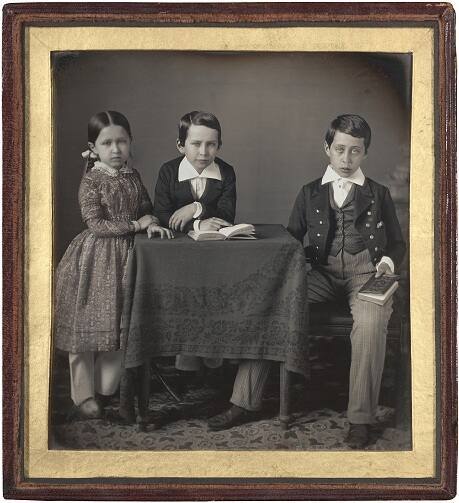 DescriptionImage of three children ( two boys and a girl) at a table with an open book on it. This three-quarter plate daguerreotype is housed in a gilt paper mat.