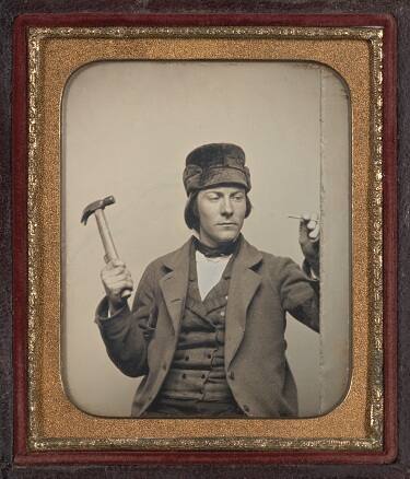 DescriptionImage of a man holding a hammer in one hand and a nail up the wall in the other. This sixth plate cased daugerreotype is housed in a brass mat inside of a case with an embossed dark red velvet liner.